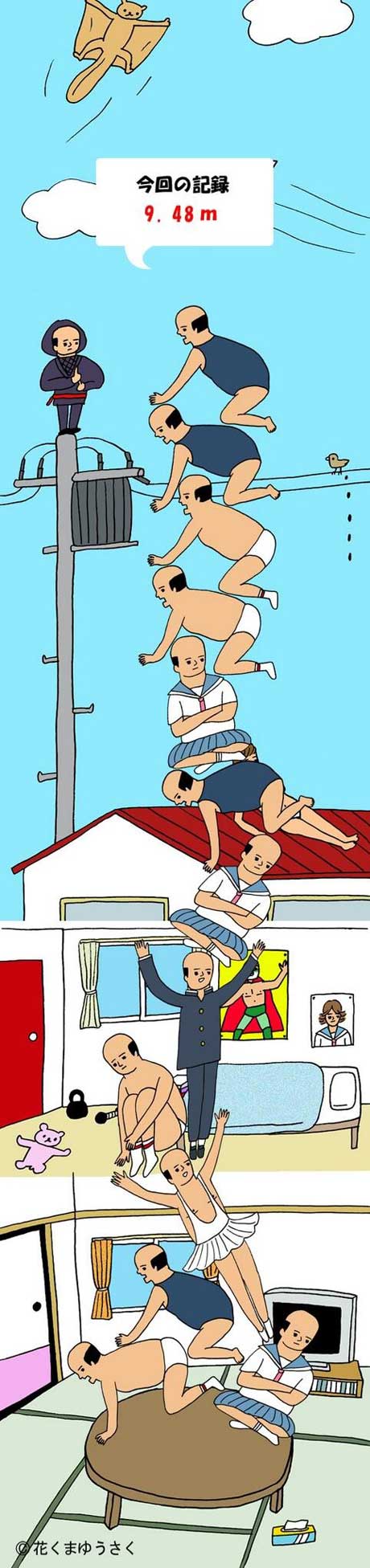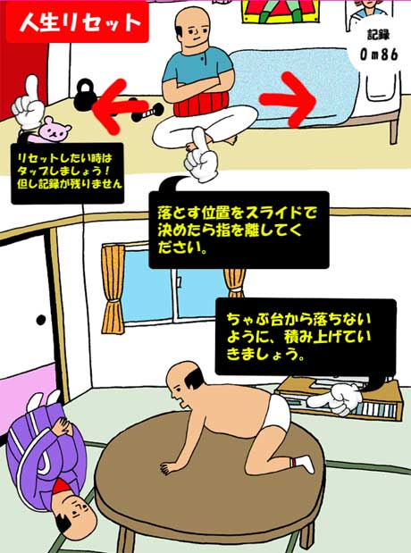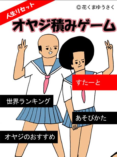 第一弾は積みゲーです。積み上げ方は多数あり、絶妙な積み方で積み上げて行くと オヤジとアフロ君の何とも言えないシュールな山積みができます。